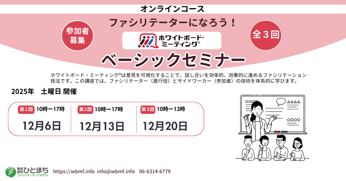 ホワイトボード・ミーティング®は、6つの会議フレームで構成される効率的、効果的な会議の進め方です。進行技術のファシリテーションは、練習すると上手になります。本セミナーでは、3つのベーシックフレームの進め方とアレンジを学びます。メンバーに良好なコミュニケーションを育み、人と組織が成長する「元気になる会議」の進め方を一緒に練習しましょう。ご参加をお待ちしています。