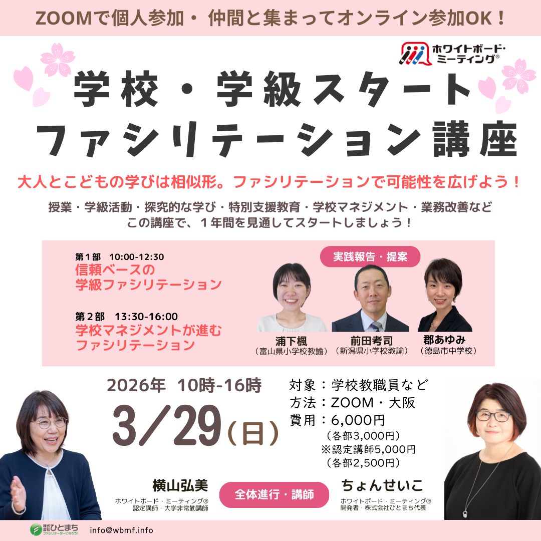 先生と子どもたちがファシリテーターになるとコミュニケーションが得意な子も苦手な子も友達の意見を聞き、自分の意見を伝え、対話的、協働的な関係をベースにした学級経営や授業づくりを進めやすくなります。「心の体力」が温まり、一人ひとりが本来もつ力を発揮する。そんなエンパワメント学びの場づくりを加速するファシリテーションを学びましょう!