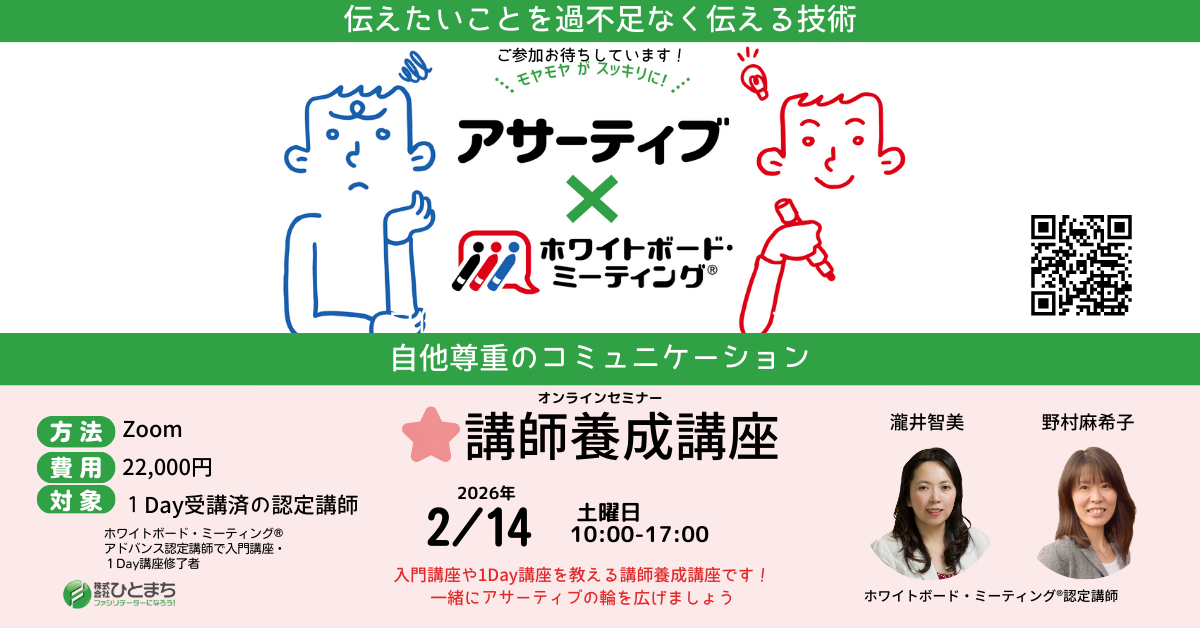 【オンライン】アサーティブ×ホワイトボード・ミーティング®︎講師養成講座 2/14 2026 2/26 終了 2025年04月13日2026年02月26日 アサーティブ入門講座や1Day講座を教える講養成講座です。一緒にアサーティブの輪を広げましょう! >>>チラシはコチラ ※開催日の3日前までにお申し込みください。 終了 シェアする URLをコピーしました! URLをコピーしました! 【オンライン】認定講師Lab_学校教育系 6/28 【東京】教育×気軽な勉強会(東大和市)4/18