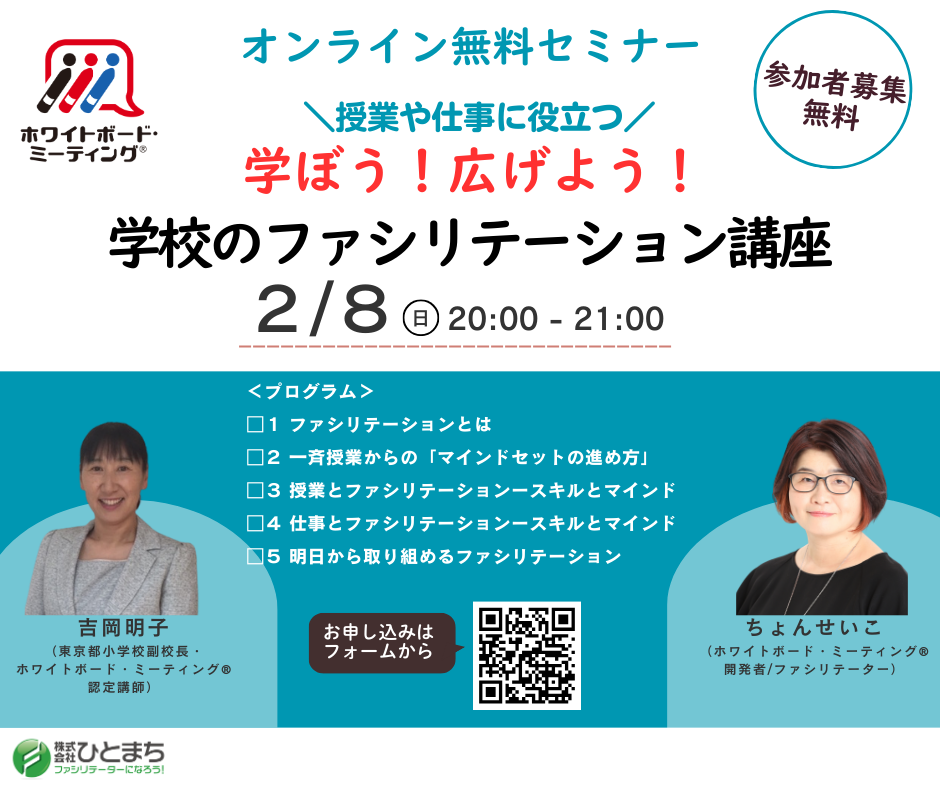 【オンライン】学校のファシリテーション講座(授業や仕事に役立つ) 2/8 2026 3/05 終了 2026年01月23日2026年03月05日 効果的な学校マネジメントにつながる「学校の授業や仕事に役立つファシリテーション 」について学ぶオンライン無料セミナーです。みなさまのご参加をお待ちしています。 >>>チラシはコチラ 終了 シェアする URLをコピーしました! URLをコピーしました! 【東京】教育×気軽な勉強会(東大和市)1/30 【大阪】高齢者・障害者支援×気軽な勉強会(池田市)2/19