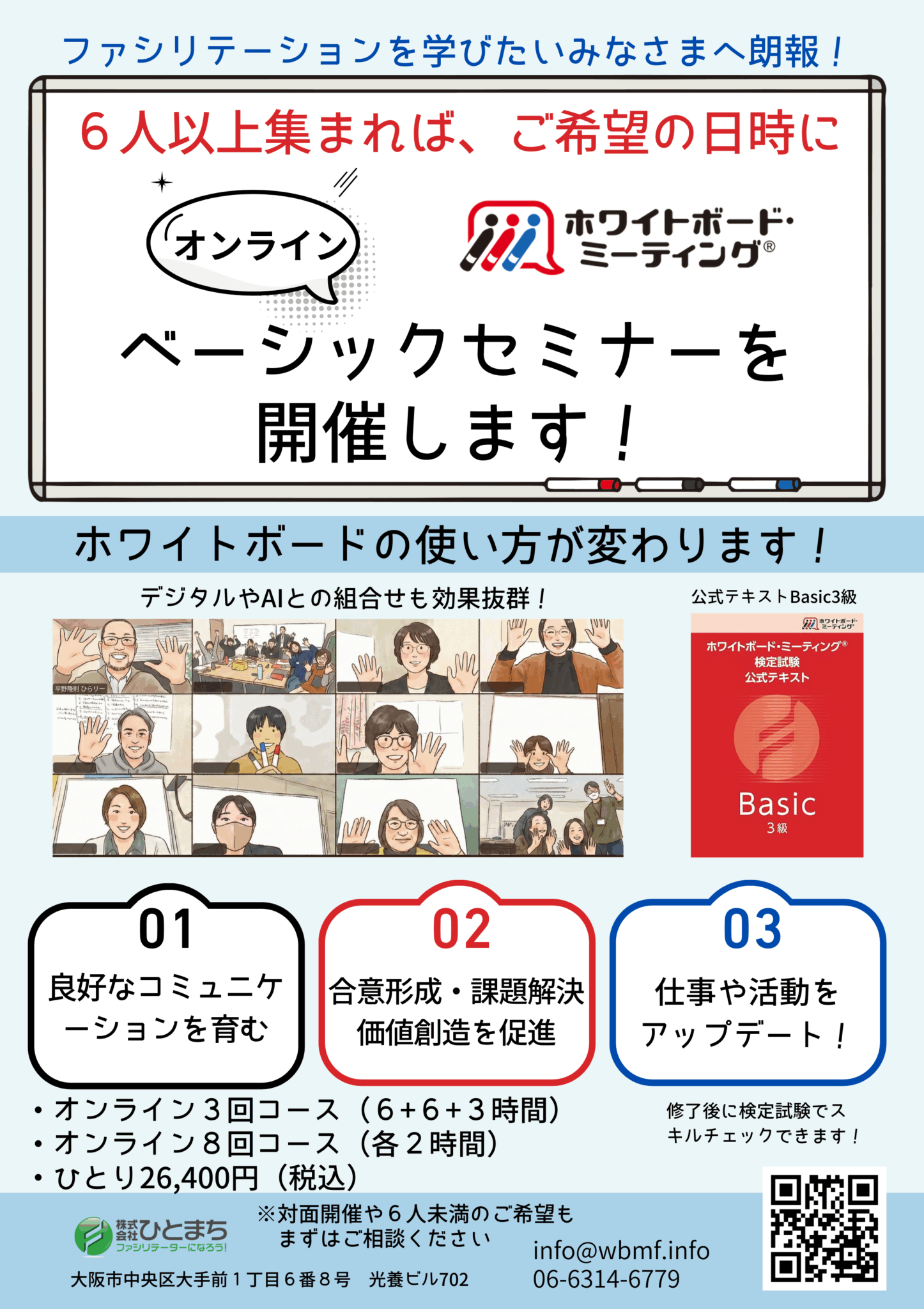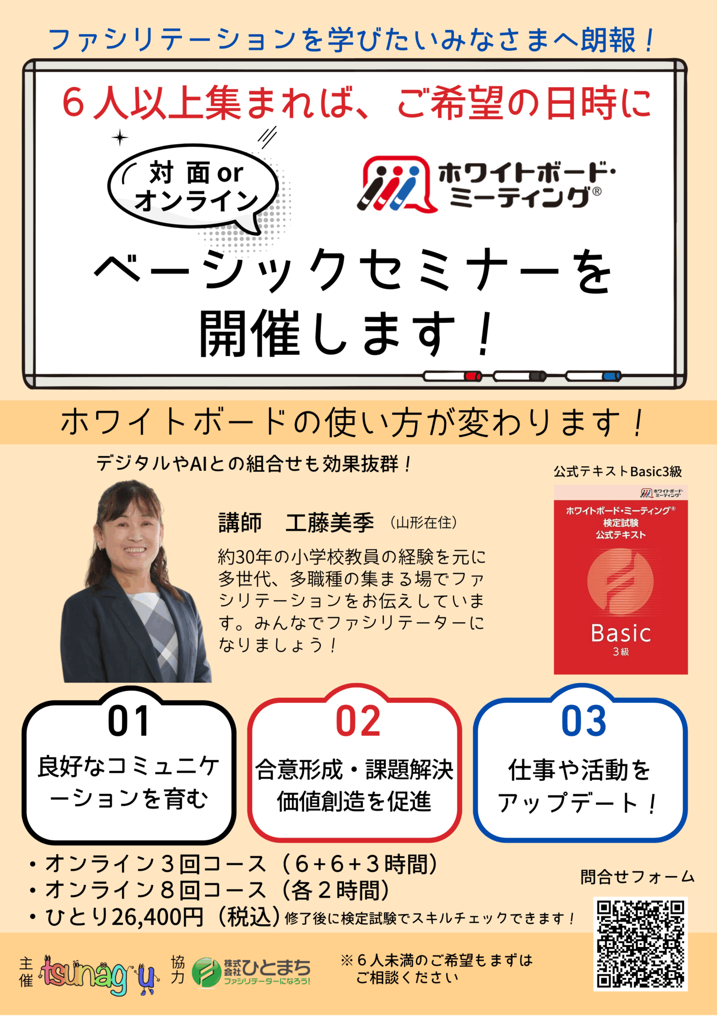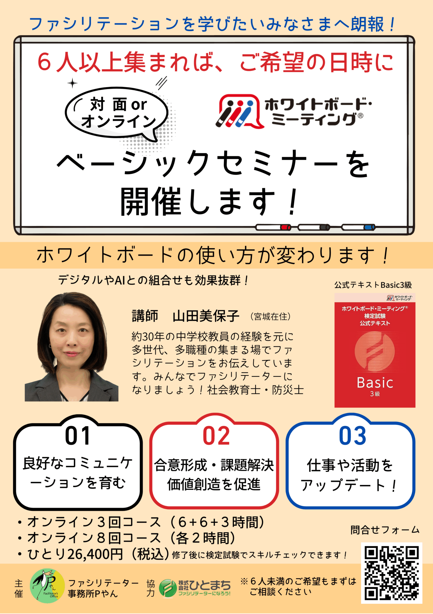 もし日程の都合がつかない場合、受講希望者が6人以上集まれば、お好きな日時でベーシックセミナーを開催することも可能です。会社や趣味、サークル、地域活動など、身近な仲間を募って、ベーシックセミナーを計画してみませんか。