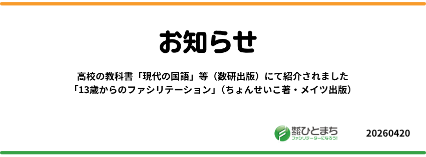 数研出版発行の高校国語教科書に、ちょんせいこの著書「13歳からのファシリテーション」(メイツ出版)が紹介されました。掲載されたのは「改訂版 現代の国語」「改訂版 高等学校 現代の国語」「改訂版 新編 現代の国語」「増補新版 現代の国語」の4冊。2026年4月から使用される教科書です。