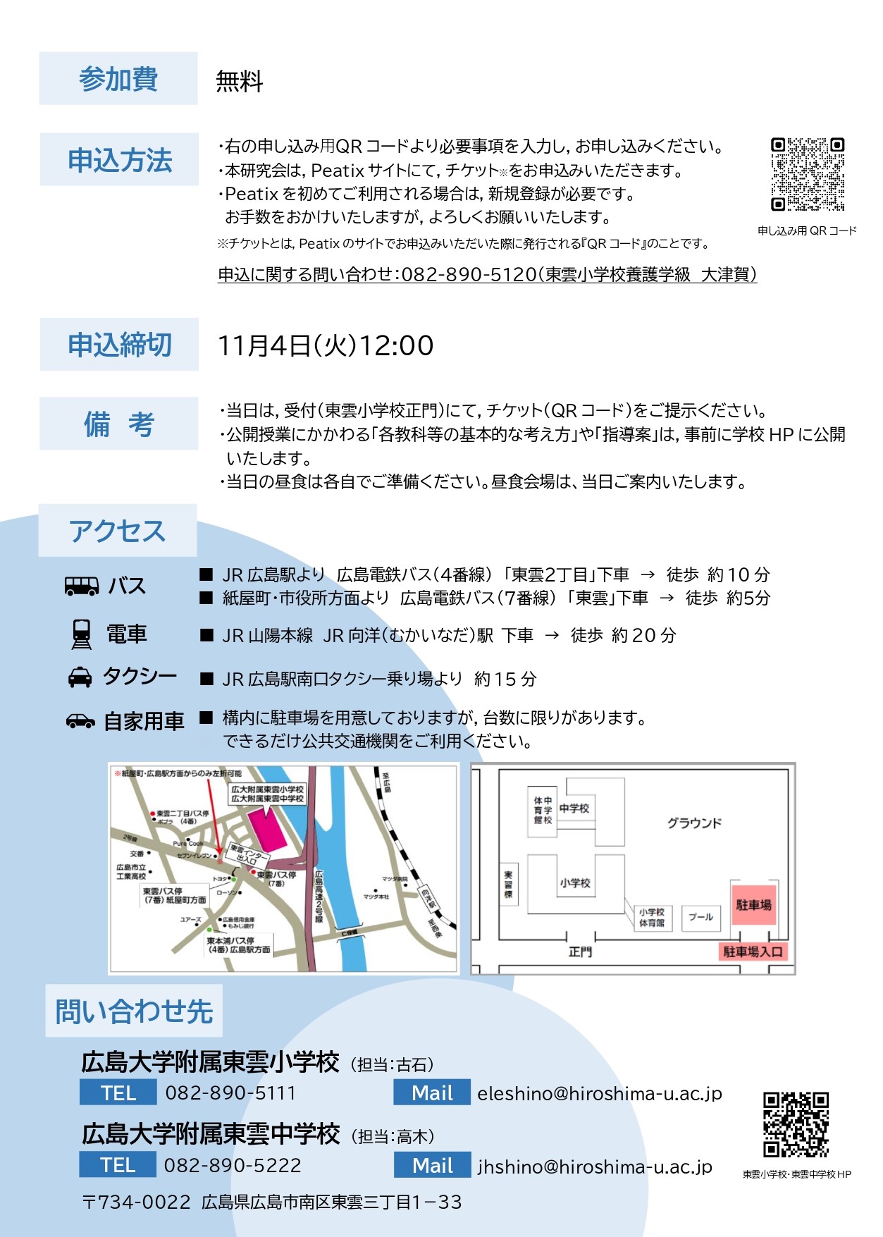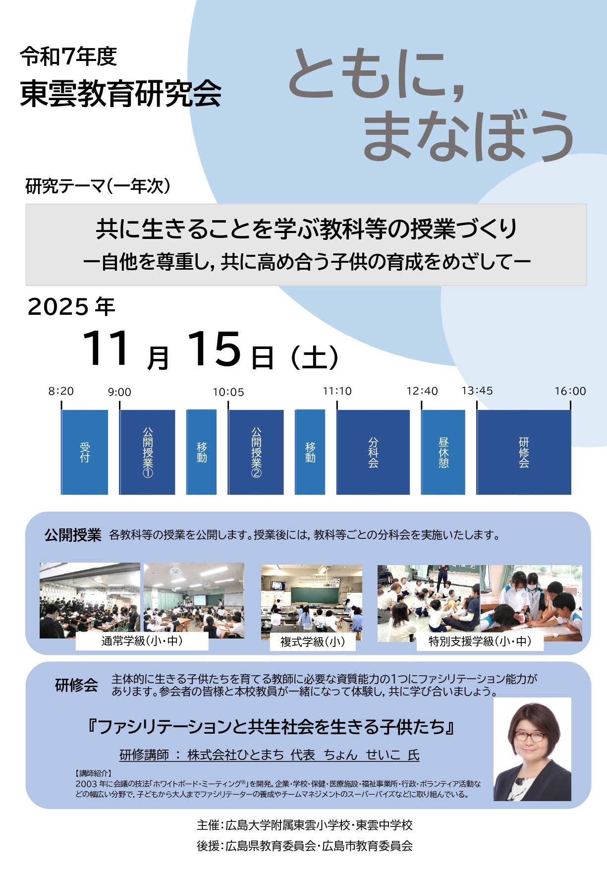 広島大学附属東雲小学校・中学校では、2025年11月15日(土)に「東雲教育研究会」を開催します。