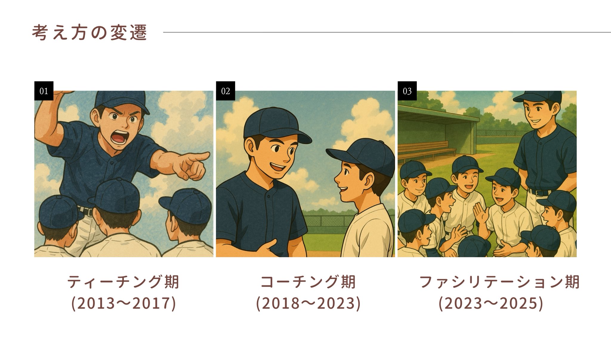 瀬良さんは監督の指導中心の「ティーチング期」。一対一の対話を通じて子どもを導く「コーチング期」。子どもたちの力を信じ、子どもたちがファシリテーターとなり対話や行動を促す「ファシリテーション期」の3つの流れを説明。そのバランスを大切に進めてきた実践についての報告がありました。