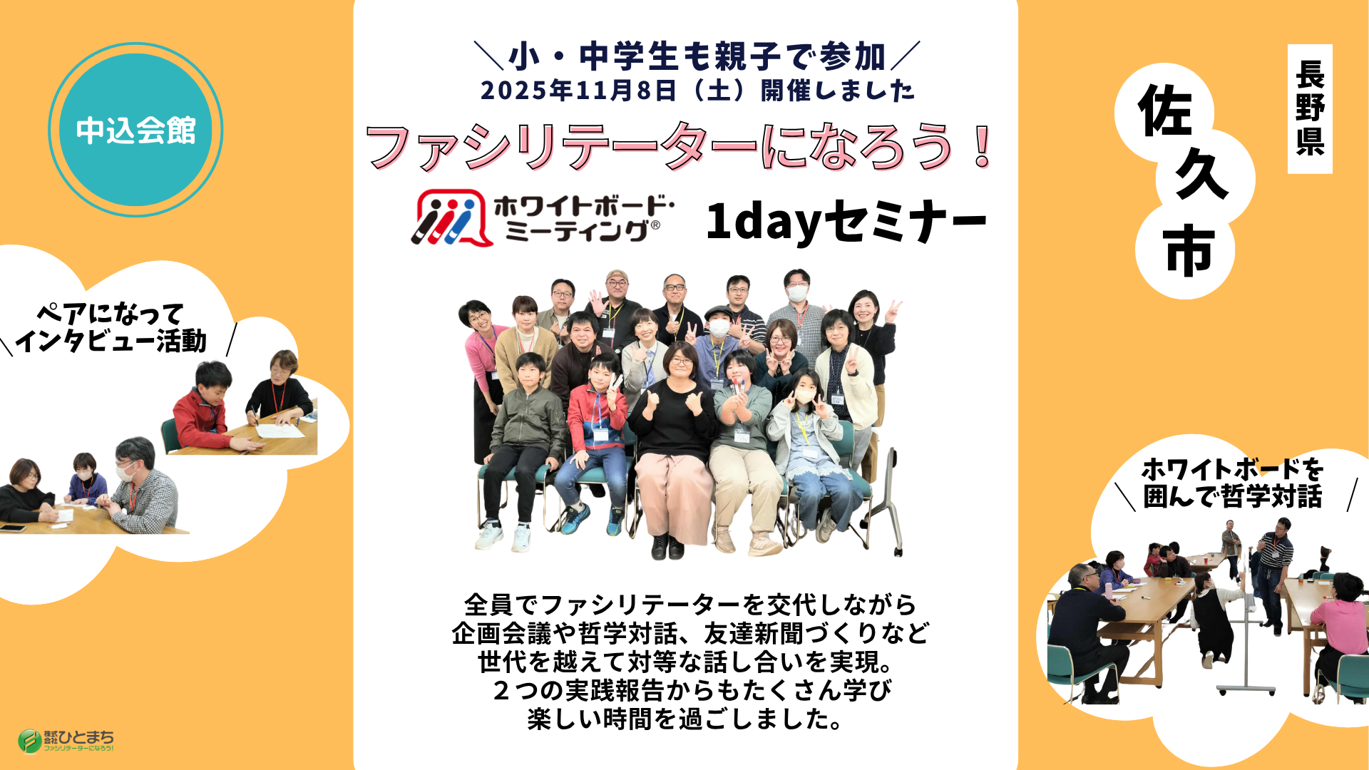 長野県佐久市で2025年11月8日、「ホワイトボード・ミーティング®1dayセミナー」を開催しました。今回は親子参加が5組もあり、小・中学生から大人まで一緒になって、ファシリテーションを体験しました。