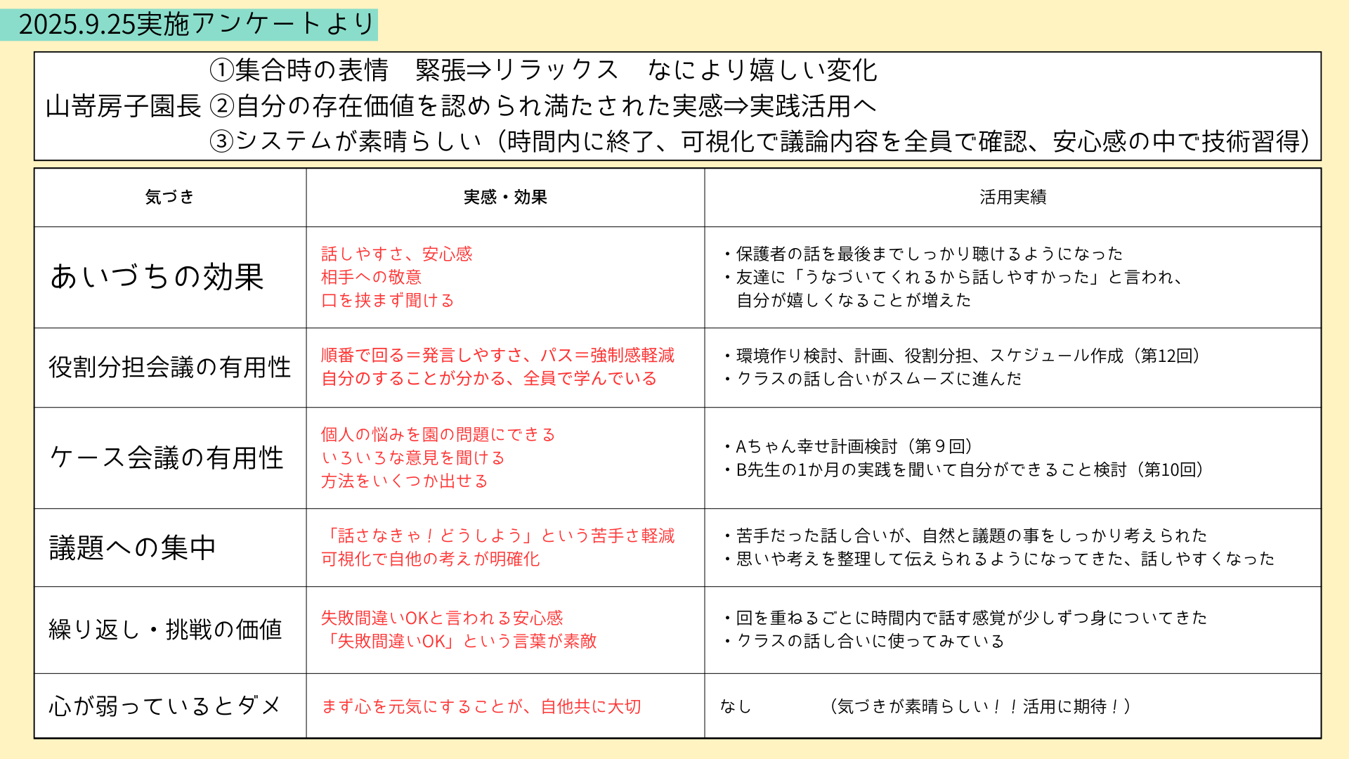 1年間の研修と実践を通して、山嵜園長は「一人ひとりの意見が尊重されることで、それぞれがチームの一員であることを実感。話し合いの場で、気軽に思いやアイデアが出せるようになりました」と振り返り。