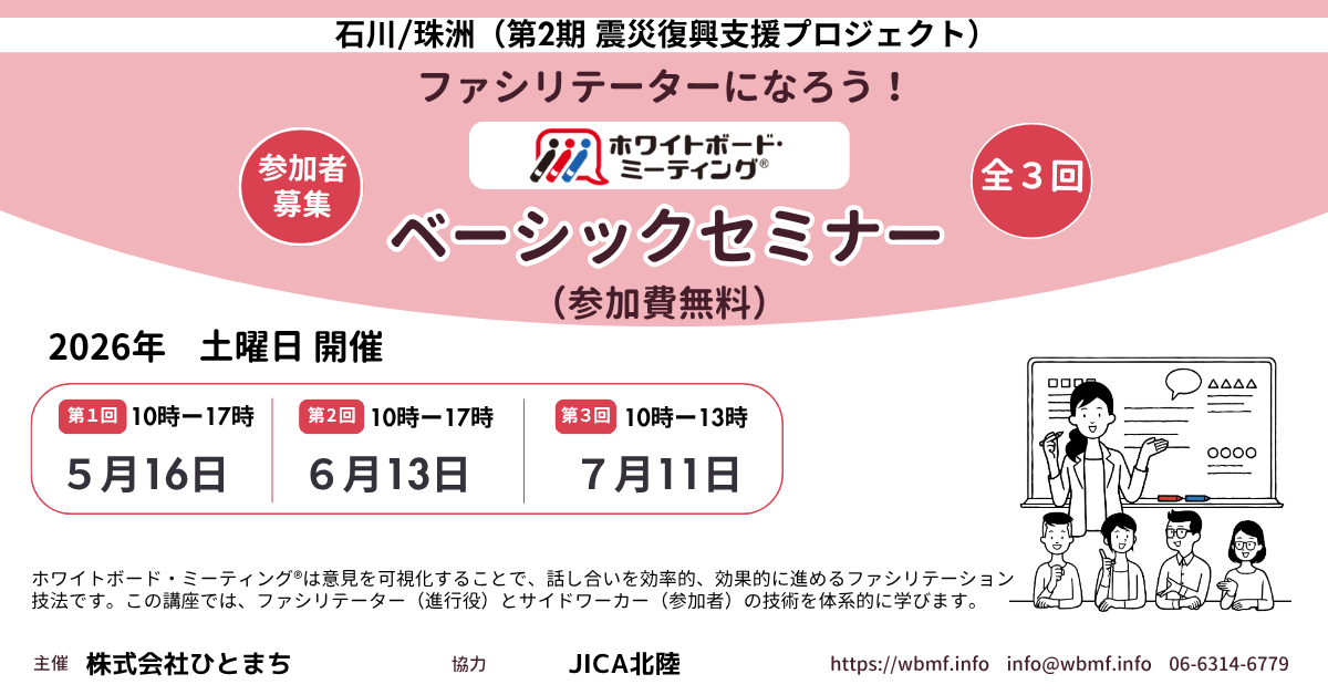 復興のプロセスには、たくさんの話し合いが必要です。ホワイトボード・ミーティング®︎は意見を可視化することで、話し合いを効率的、効果的に進めるファシリテーション技法です。この講座では、ファシリテーター(進行役)とサイドワーカー(参加者)の技術を体系的に学びます。