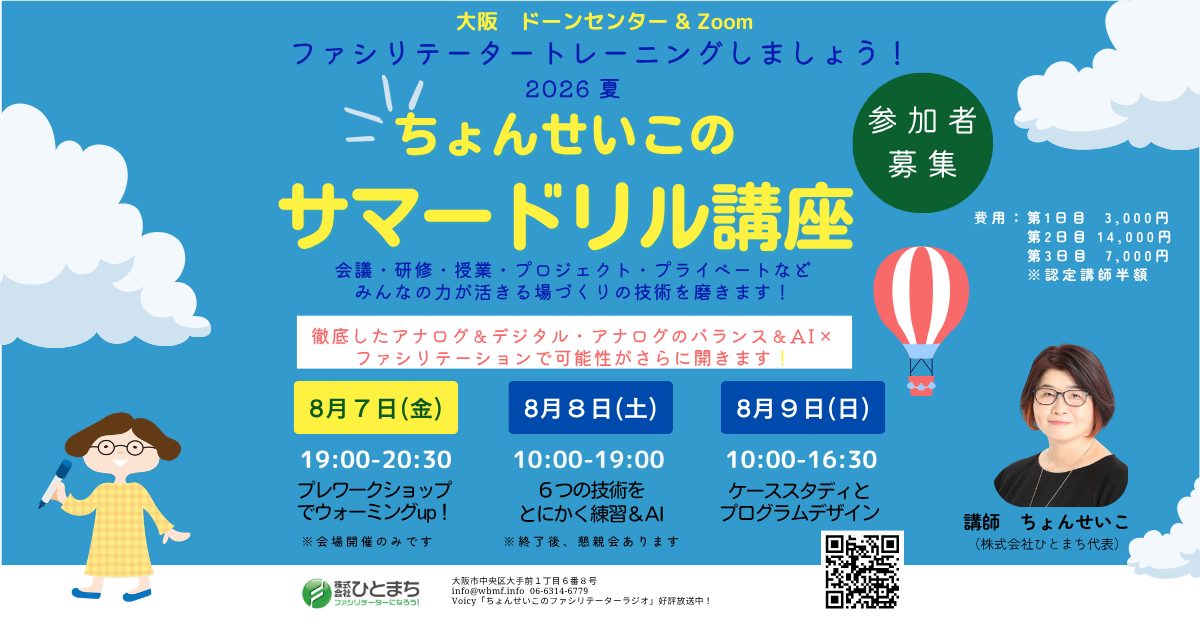 8月7日:プレワークショップ(会場開催。オンラインではご参加いただけません) 8月8日:6つの技術をとにかく練習&AI 8月9日:ケーススタディとプログラムデザイン *動きやすい服装でご参加ください <オンライン参加の方はご準備ください> *パソコンなどの端末機器(タブレット・スマホでも可) *インターネット環境 *ホワイトボード(シート)と黒赤青のマーカー (A4用紙と3色サインペンでも結構です) |