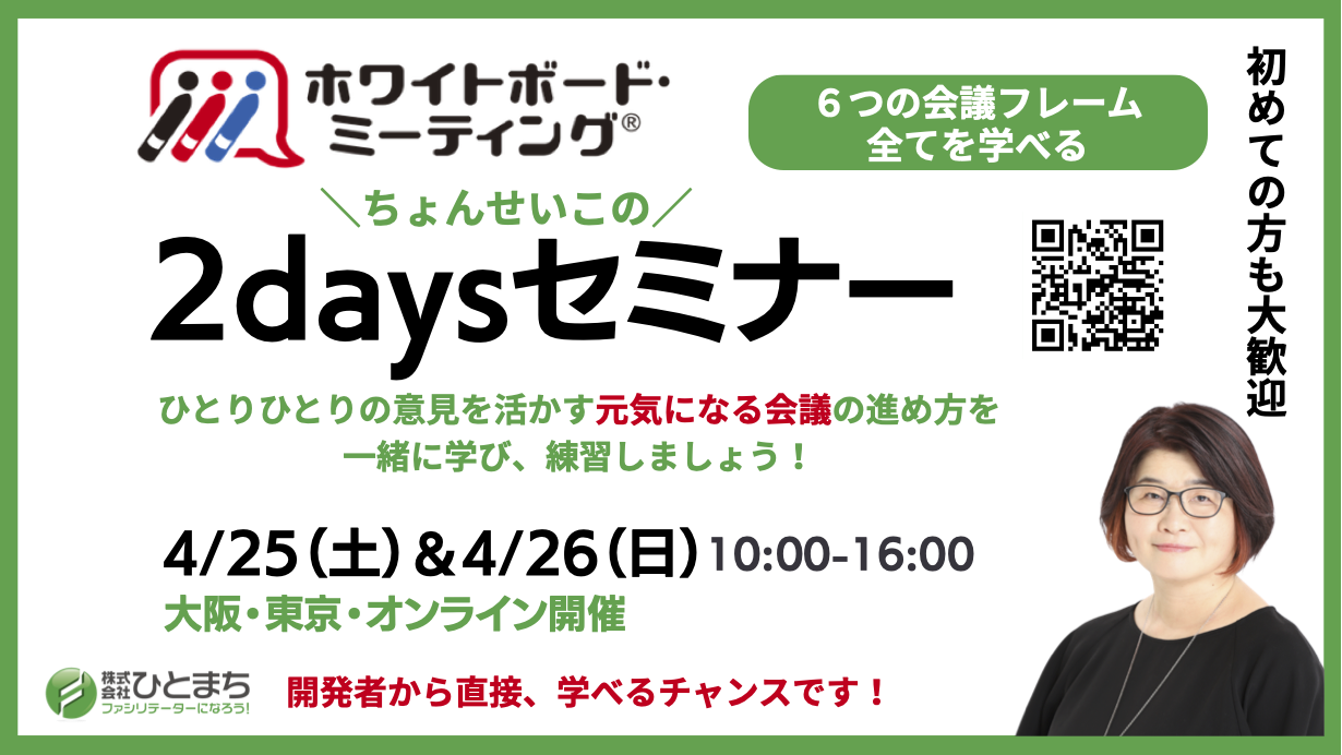 ホワイトボード・ミーティング®の6つの会議フレームすべてを学ぶ2日間セミナーです。ホワイトボード・ミーティング®︎開発者のちょんせいこが講師をつとめます。開発者から直接、学べるチャンスです。この機会にぜひ、ご参加ください。