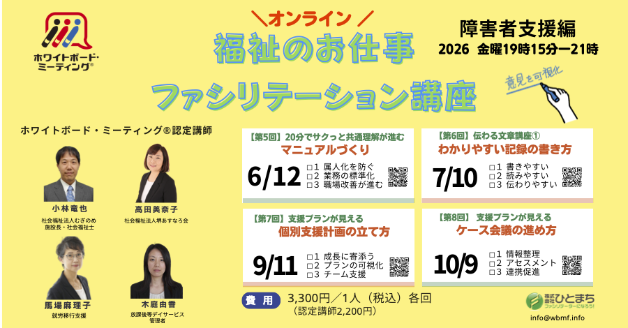 ホワイトボード・ミーティング®︎は、福祉の仕事に有効な技術です。この講座では、「福祉のお仕事に役立つ」ファシリテーション技術の向上をめざします。
