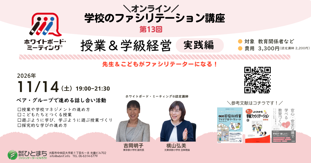 先生&こどもがファシリテーターになると授業や学級経営、学校マネジメントが効果的に進みます。この「学校の授業&学校経営」シリーズでは、ホワイトボード・ミーティング®︎を活用して「一人ひとりの意見を活かした学びや仕事」を進めるスキルとマインドを学び、練習します。ぜひ、ご参加ください。
